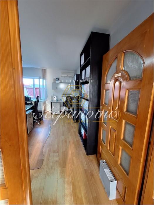 Kuća je građena kvalitetno, sendvič zidom debljine 42 cm, sa PVC stolarijom, i u potpunosti je prilagođena poslovnoj nameni. Prostor je organizovan kao kancelarijski, sa ukupno devet soba, salom za sastanke, kuhinjom i pratećim prostorijama, uz razvijenu računarsku mrežu i posebnu prostoriju za serversku opremu. Objekat je obezbeđen video nadzorom i alarmnim sistemom, dok optički internet omogućava brz i stabilan rad. Grejanje je rešeno putem novog gasnog kotla. Raspored prostorija je praktičan i omogućava lako prilagođavanje različitim poslovnim potrebama, dok sprat nudi dodatne kancelarije i arhivski prostor.