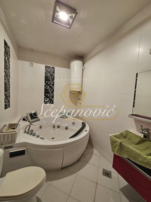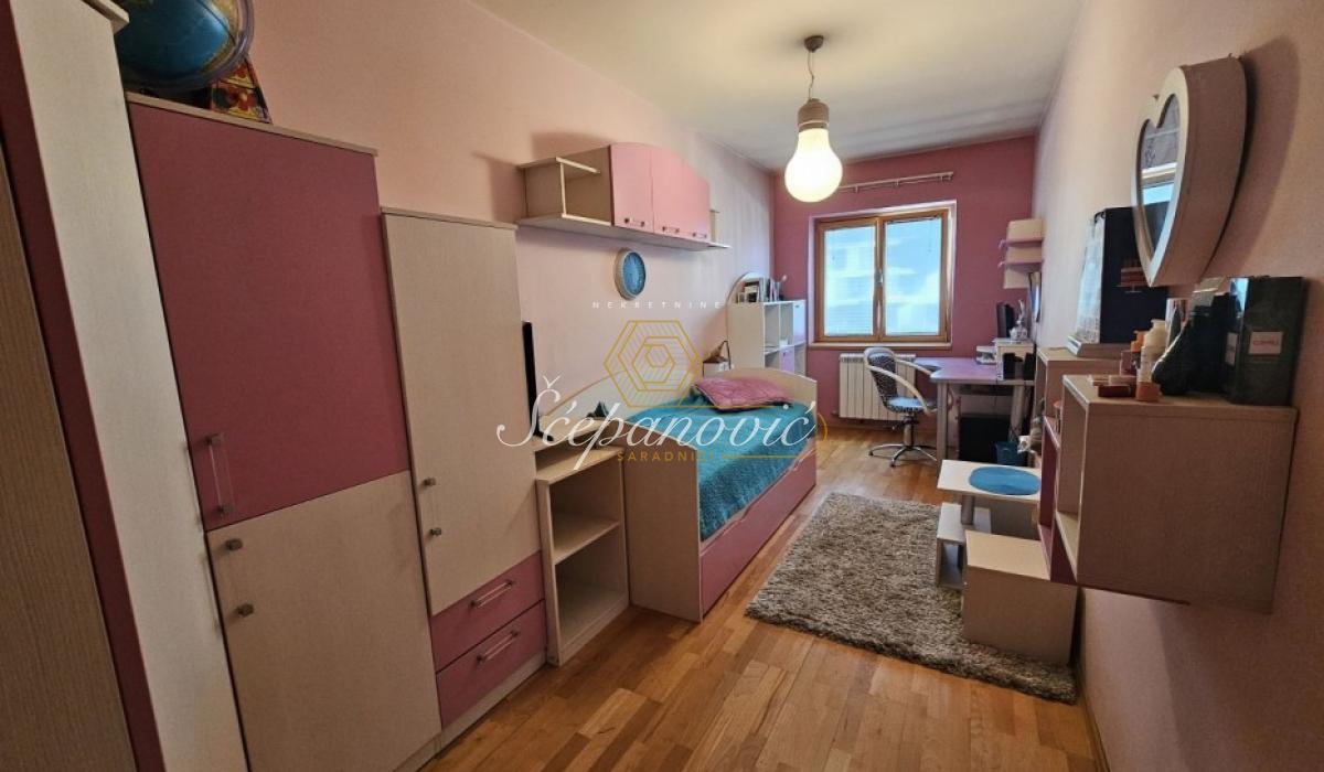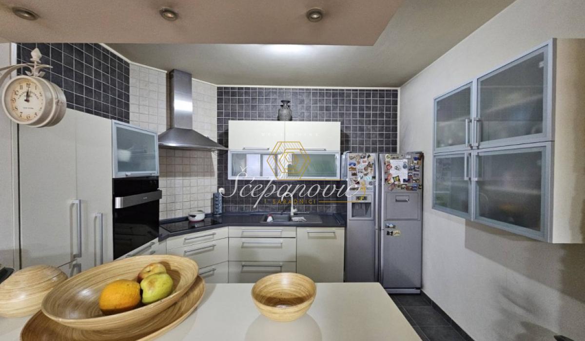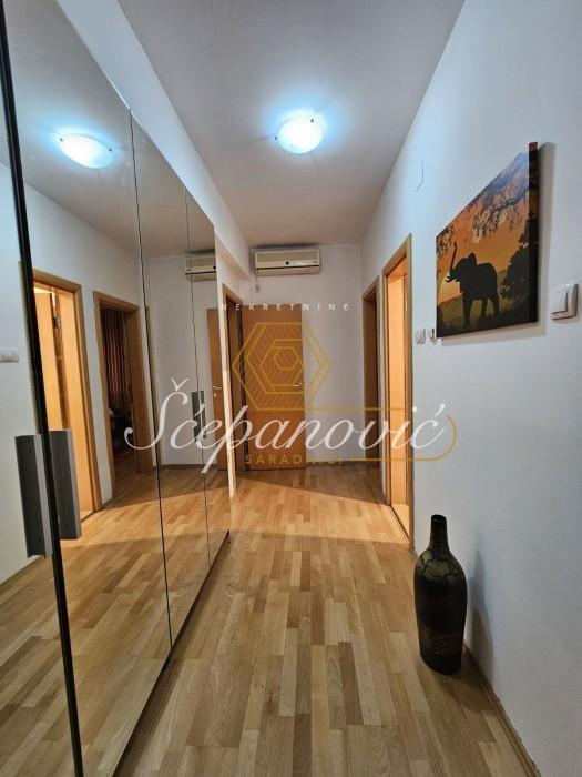 Predstavljamo Vam prodaju prostranog četvorosobnog stana idealnog rasporeda. Čine ga sledeće prostorije: ulazni hodnik sa ostavom/vešernicom, dnevna soba sa izlazom na terasu koja je zastakljena portalima, trpezarije iz koje se ulazi u uvučenu kuhinju odvojenu šankom, dva deganžmana iz kojih se ide u tri spavaće sobe (od kojih je jedna sa sopstvenim garderoberom) i dva kupatila (od kojih jedno poseduje đakuzi kadu). Stan je nastao pripajanjem dva stana - garsonjere od 34m2 i redovnog četvorosobnog stana od 100m2, pa je samim tim dobijen veći prostor u kom se nalaze trpezarija i kuhinja. Poseduje sve odlike jednog četvorosobnog stana, idealne je kvadrature i rasporeda (iz hodnika se ide u sve prostorije). U cenu stana je uračunata ugradna kuhinja rađena po meri i plakari. Odlično je održavan, ulaganja su potrebna ukoliko postoji potreba i želja za tim. Stan se nalazi na 6. spratu, na redovnoj etaži. Uz kupovinu stana postoji mogućnost kupovine i garaže površine 16m2, u koju može da stane manji automobil. Pripajanje stanova je izvršeno fizički, ali nije papirološki, pa samim tim budući kupac može izvršiti papirološko pripajanje, ukoliko mu je to potrebno. Uknjiženo.