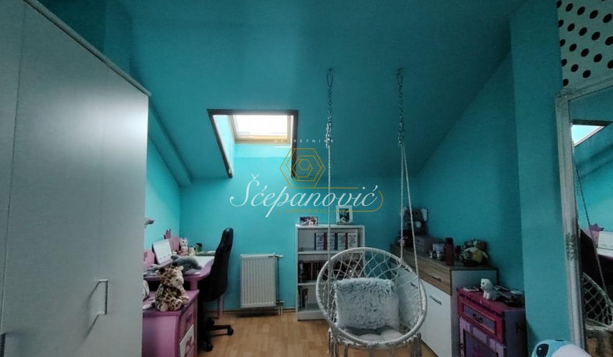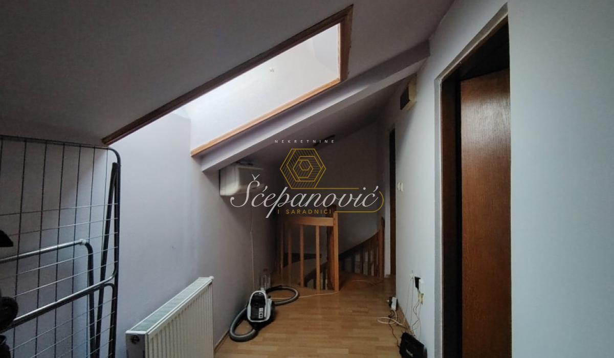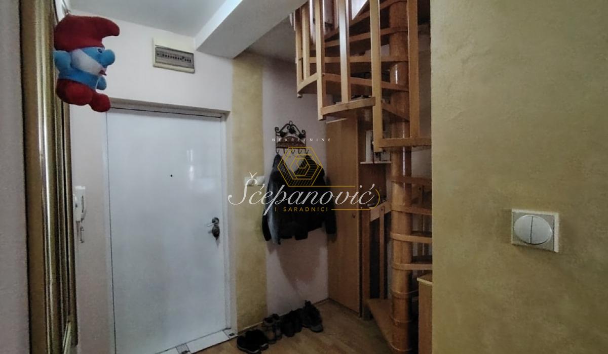 Na prodaju trosoban duplex na veoma dobroj lokaciji. U donjoj etaži se nalazi predsoblje, dnevni boravak sa kuhinjom i trpezarijom, toalet i terasa. U gornjoj etaži se nalazi hodnik iz kojeg se ulazi u dve prostrane spavaće sobe i kupatilo. Kosine ne ometaju funkcionalnost prostora, počinju na visini od 1,70m. Gore su krovni Velux prozori i kompletno iznad je betonska ploča, koja ovakvim stanovima daje sigurnost od prokišnjavanja. U stanu kupcu ostaju svi elemnti rađeni po meri (kuhinja i ormari). Za ostale stvari je moguć dogovor. Stan ima pripadajuću podrumsku prostoriju, a u dvorištu zgrade dostupan je zajednički parking za stanare.