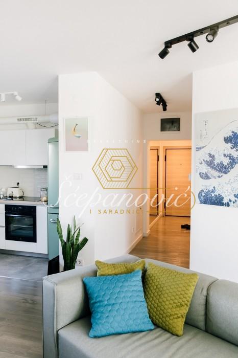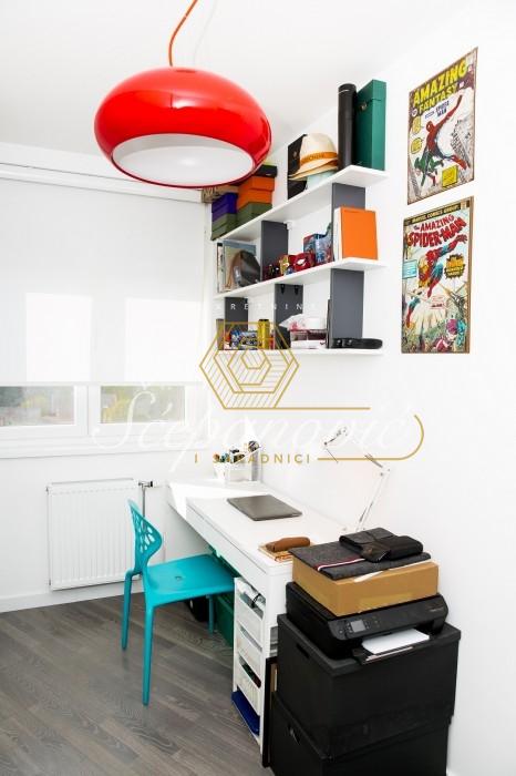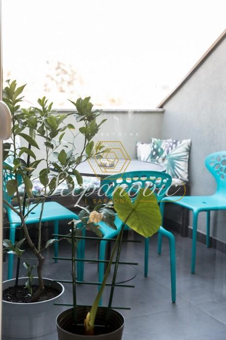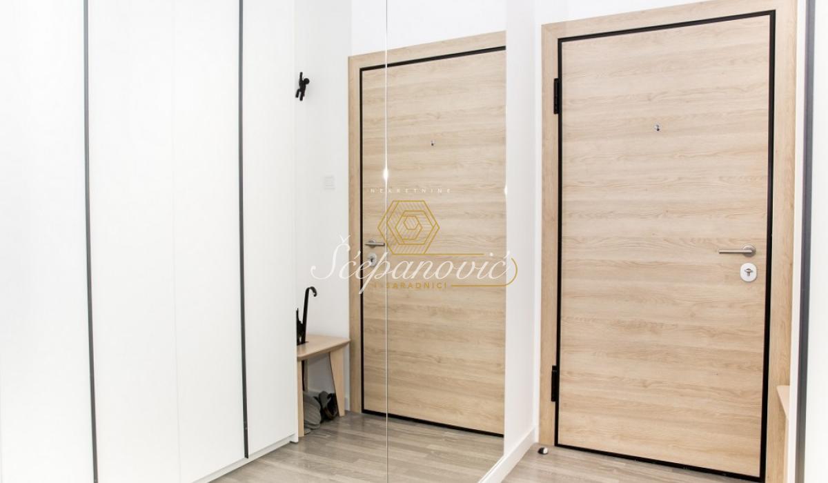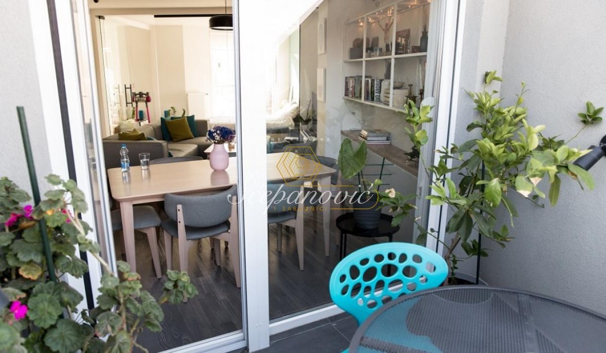 Ovaj moderno opremljen dvoiposoban stan se prostire na 63m2 i dvostrano je orijentisan. Stan je svetao, dizajnerski osmišljen i sav nameštaj je rađen po meri. Sačinjen je od dnevnog boravka, spavaće sobe, manje prostorije sa garderoberom koja je u funkciji radne sobe, kuhinje, trpezarije, kupatila, kao i hodnika duž kojeg su ugrađeni ormari koji pružaju mnogo prostora za odlaganje ličnih stvari. Takođe, u stanu se nalaze i dve terase koje pružaju mnogo dnevnog svetla. Stan se prodaje polu ili kompletno namešten, u cenu je uključeno i parking mesto u dvorištu zgrade. Postoji i mogućnost kupovine garažnog mesta.