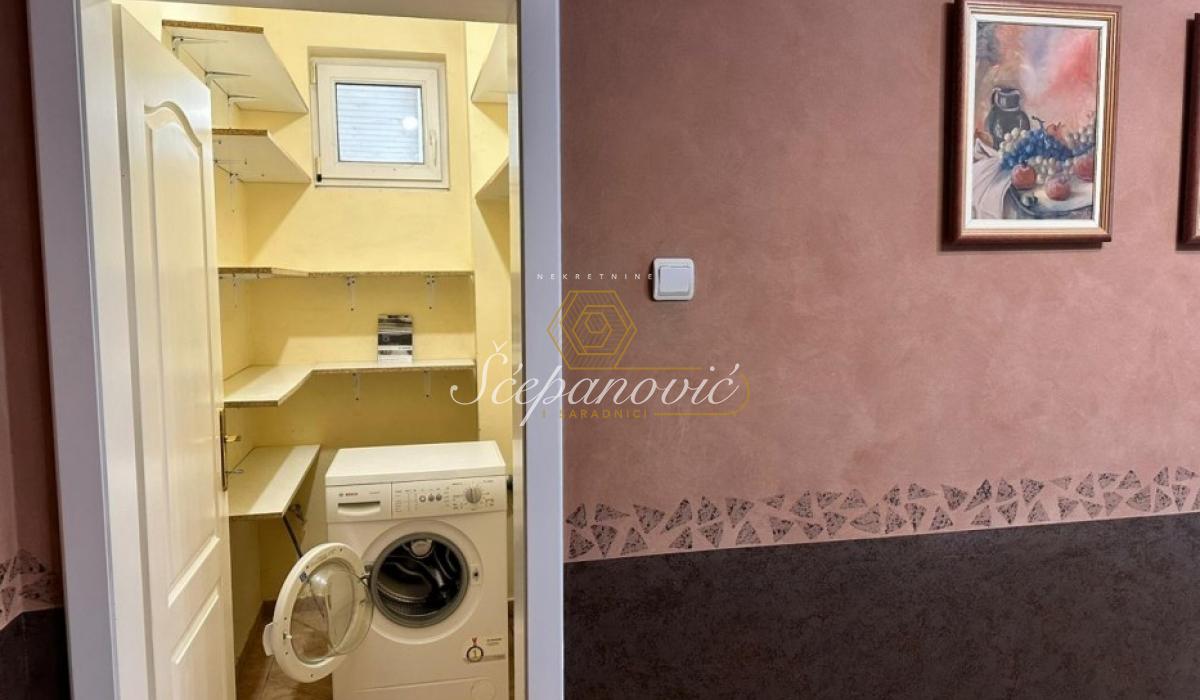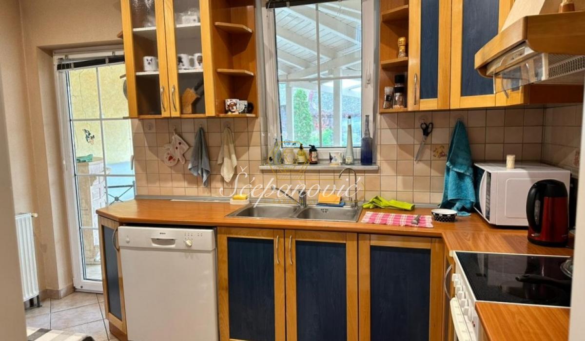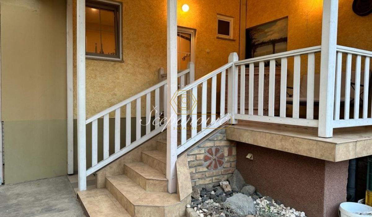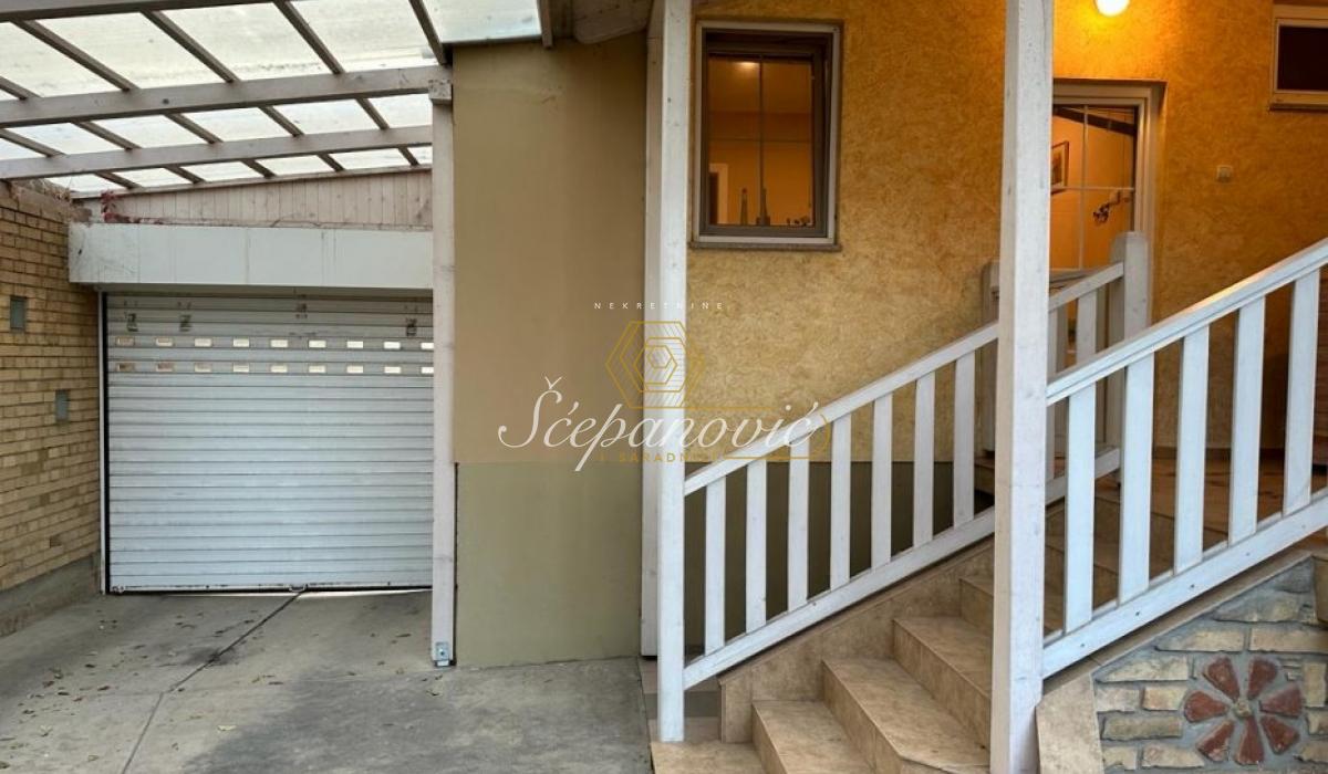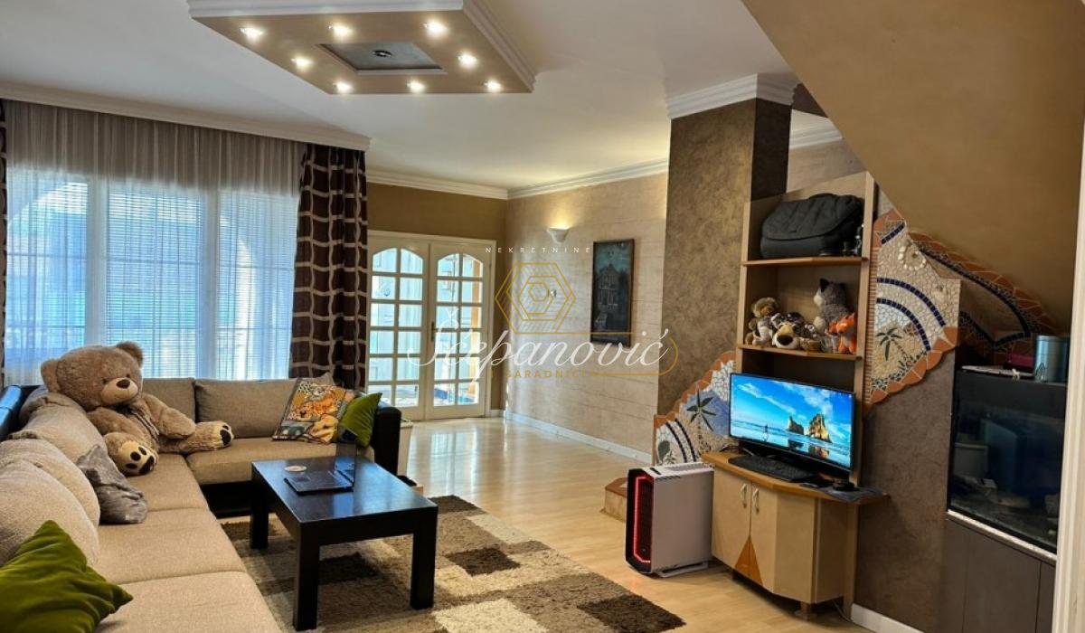Prodaje se kompletno opremljen porodičan četvoroiposoban stan u urbanoj vili u tri nivoa, površine 193m2, na delu placa koji pripada ovom vlasniku, površine 290m2, a ukupna površina placa iznosi 638m2. Konstrukcija kuće je monolit, keramička cigla, zidna izolacija stiropor, prednja završna obrada - dekorativni malter. Prozori su sa dvostrukim staklom i roletnama. Ograda od dekorativnog maltera i cigle. Grejanje je na gas, ima svoj gasni kotao. Urađena je sva infrastruktura i priključeno je na gradsku mrežu: voda, trofazna struja, odlaganje smeća. Ugrađen nov sistem za filtriranje vode za smanjenje tvrdoće vode i uklanjanje kamenca. Postoji internet iz optičke mreže IPTV. U suterenu se nalazi garaza, soba za odmor sa finskom saunom i kupatilom. Prizemlje kuće čine: hodnik, prostran dnevni boravak sa terasom, kuhinja sa trpezarijskim delom, ostava u koju staju veš mašina i sušilica, terasa sa izlazom u dvorište. Gornji sprat čine: tri spavaće sobe, dva kupatila i terasa. U sklopu kuće se nalaze garaža sa automatskim rolo vratima, tri parking mesta. U blizini kuće se nalaze svi potrebni sadržaji za jedan porodičan život. Uknjiženo.